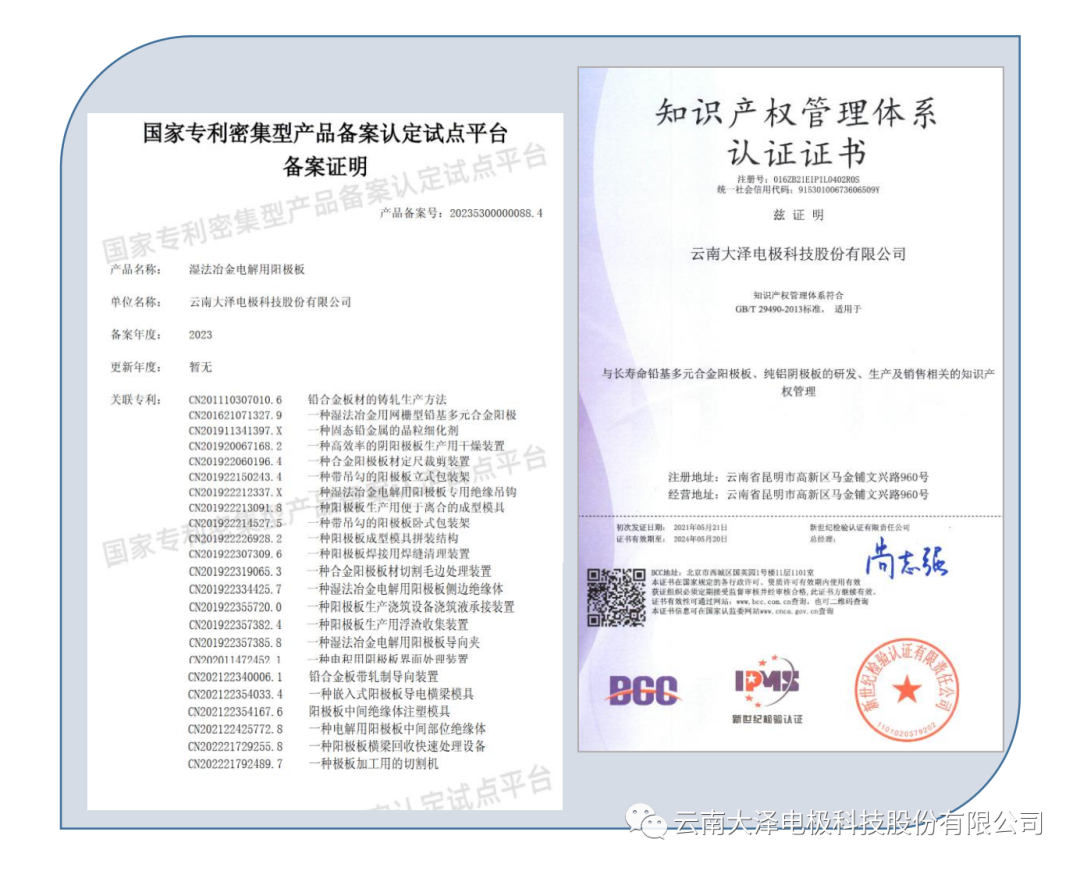 本次被認(rèn)定的產(chǎn)品名稱是“濕法冶金電解用陽極板”,國家專利密集型產(chǎn)品備案號20235300000088.4。